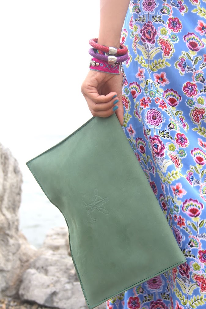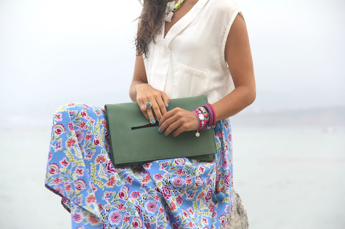 La falda ya la había estrenado para la fiesta pre-boda que tuvimos hace unas semanas en Galicia, pero ese día el tiempo estaba feo y hacía mucho viento lo que nos impidió fotografiarlo. Es una de esas prendas que ves en la percha y sabes que será siempre especial en tu armario, por el colorido, por la tela, y porque puede dar mucho juego. En esta ocasión con blanco pero admite casi todo el color que le quieras dar, estoy deseando darle un toque totalmente diferente más metidos en el otoño, si tenéis sugerencias quiero leerlas eh!!!. Al fin os enseño la preciosa cartera que tanto os gustó en las redes sociales. A pesar de que sabéis que tengo especial predilección por los bolsos grandes, desde que estamos en Madrid, lo cómodo y útil se ha impuesto en gustos, y para moverte con comodidad y tener control sobre tu bolso en el metro y por la calle nada como un bolso pequeño, así que cada vez me he aficionado más y más a los clutch originales. Cuando recibí este de AtelierMoss, no me pudo gustar más, porque aunque sea la inicial de la firma, parece la mía, y eso me