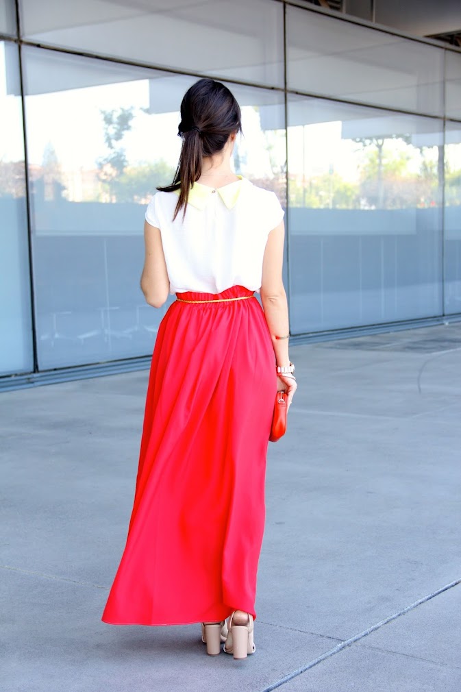 ahora me ha dado a mi por las faldas largas… porque son preciosas!! y me encanta la tuyaa!!! el rojo es de mis colores favoritos… y me gusta mucho como lo has combinado con esa blusaa =)) la correita que le has puesto le va genial!