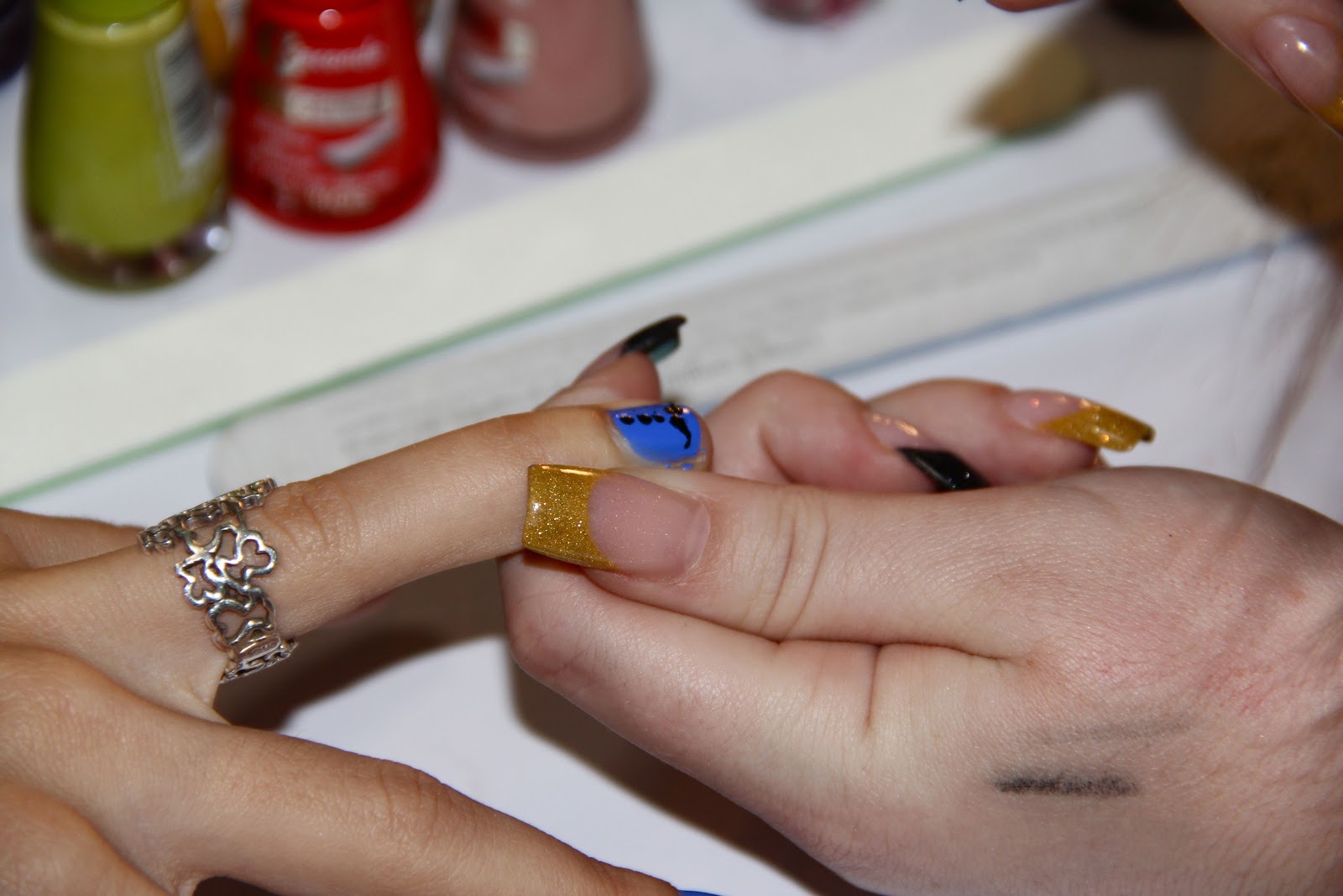 Una vez maquillada era el momento de dar color a las uñas. Como os decía el azul es uno de los colores de moda así que mejor oportunidad para probarlo que esta. Como toque personal, un par de bigotitos.