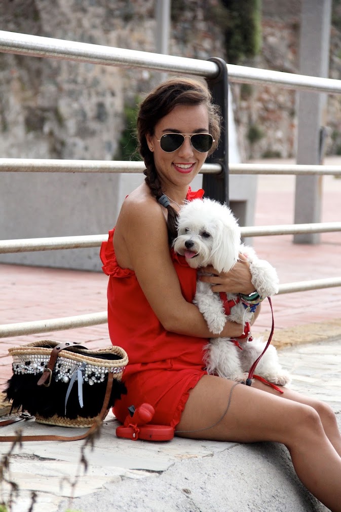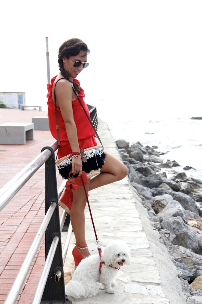 Se que en muchos lugares de España estaréis viendo el post y diréis que estoy loca tan desabrigada, cierto, estas fotos quedaron traspapeladas del último fin de semana que pasamos en la playa, pero no quería que se quedarán en el tintero por ello, con este look y aunque el tiempo siga acompañando para de momento dejar las medias guardadas, con tristeza doy por finalizado el verano y le doy la bienvenida al otoño. El mono lo tengo desde hace varios años, pero para mi es una prenda atemporal, año tras año siempre me lo pongo, ya sabéis que me encanta el rojo y creo que es una prenda muy cómoda. Las que como yo os encanten estamos de enhorabuena porque las pasarelas prometen que seguirán de tendencia. Como complemento el archi conocido capazo de Lola Guarch, estad muy atentos porque pronto tendréis una sorpresa. Como veis la pequeña Bimba amenYaza con quitarme el protagonismo porque esta hecha toda una modelo, ¡qué bonita es!