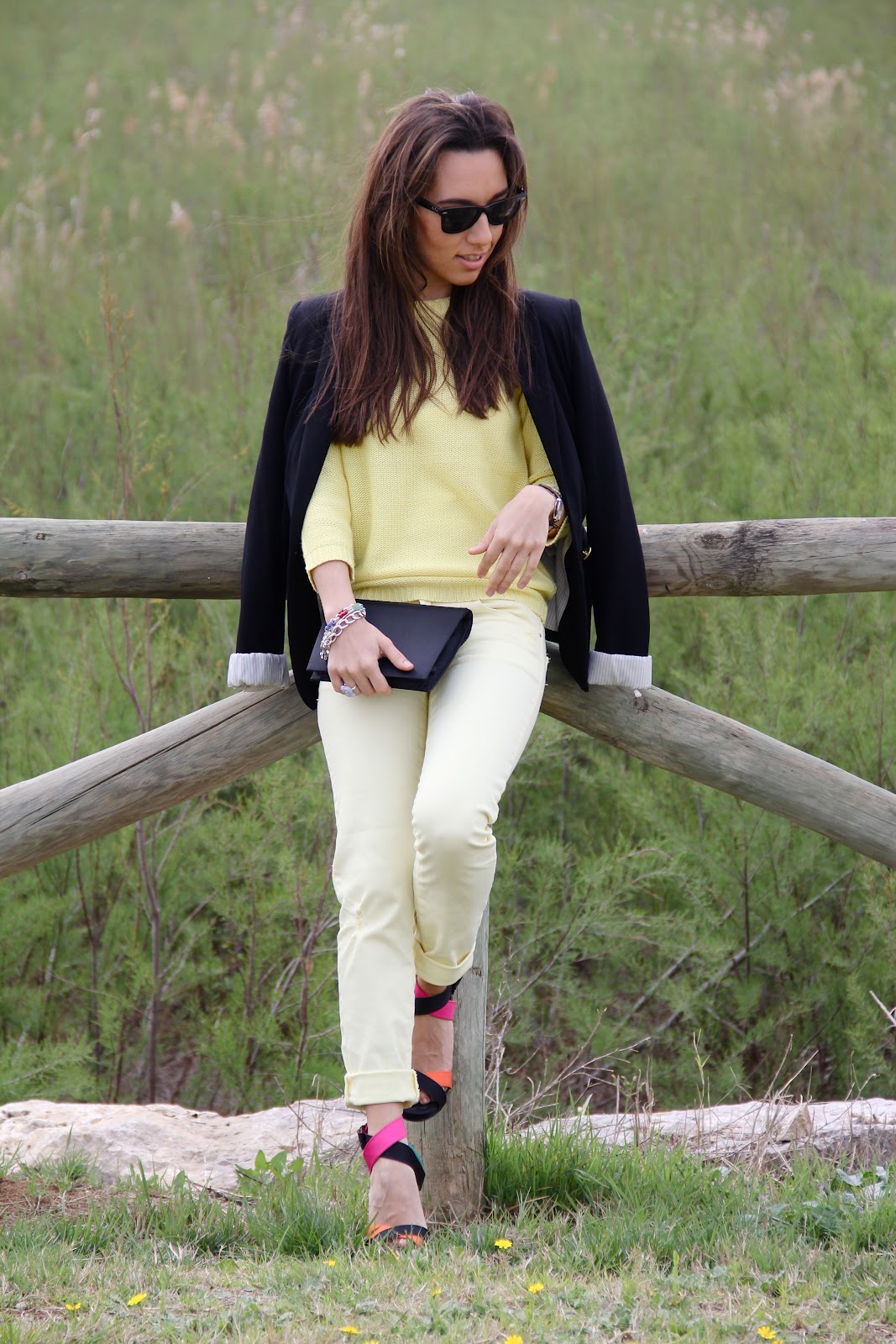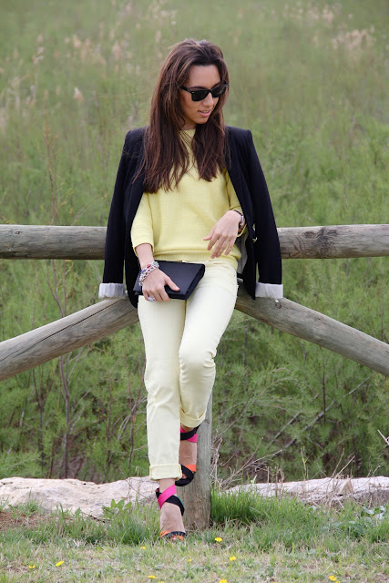 Desde que empecé a ver las tendencias de ésta primavera tenía ganas de volver a ponerme mis sandalias. Vuelven los tacones anchos y los colores fluor. Me apetecía crear un look con un solo color y utilizar los complementos para darle un contraste de colores. Es un ejemplo de como combinar los dos must de la temporada los colores pasteles y los ácidos. Y vosotras ¿os gusta combinarlos o preferís lucirlos por separado?