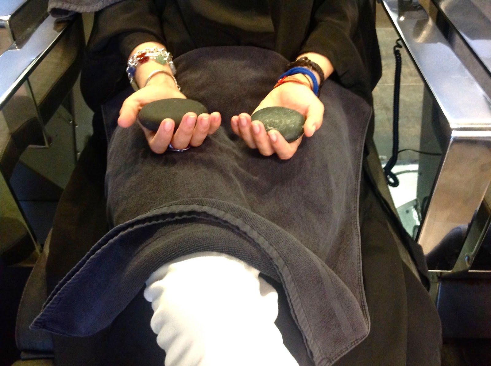 Los tratamientos con varios minutos de secador previo luego, van además acompañados de masajes relajantes (¡siempre me quedo casi dormida!), en el cuero cabelludo y unas piedras calientes en las manos para ayudar a relajarnos y aumentar el placer de los masajes.