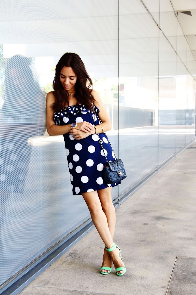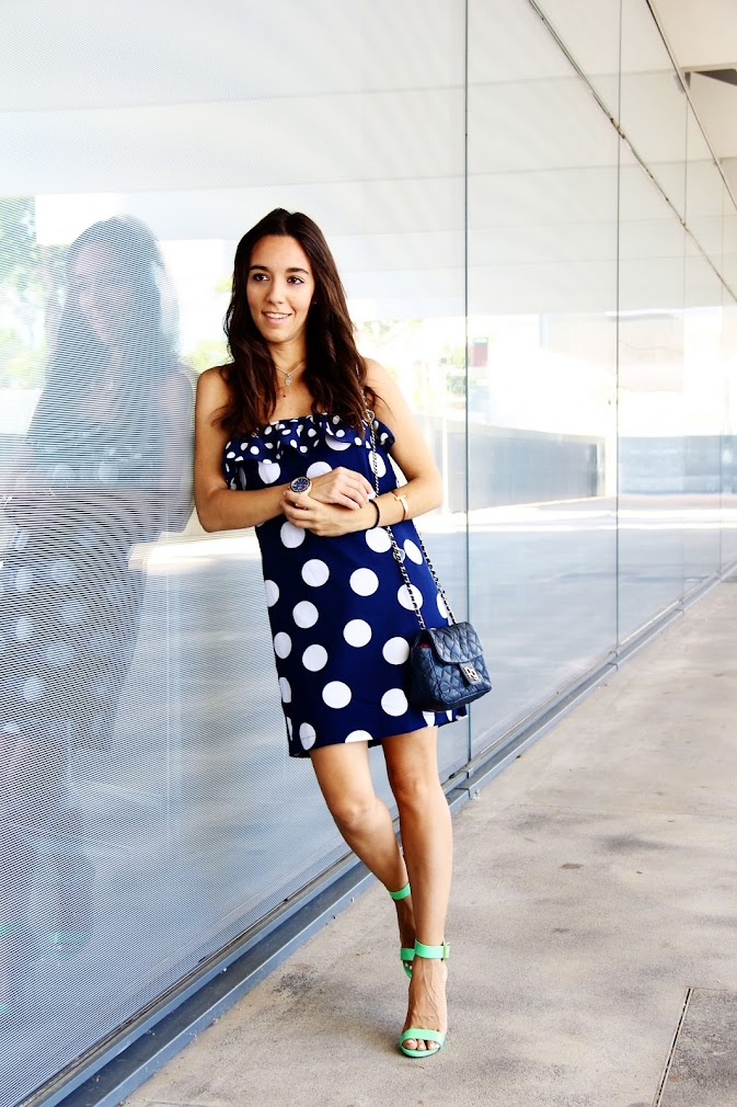 Hace poco más de un año estaba en el pueblo pasando unos días con mis abuelos y ya sabes cuando sobra el tiempo nos da por inventar y mi abuela y yo nos pusimos a sacar telas que ella tenía guardada y me enseñó a hacer patrones y cortar, entre todo eso me hizo algunas cosas, como este vestido. Que llevaba un año en el armario esperando la ocasión de ser estrenado y lo fue la semana pasada para inaugurar la terraza del Hotel Urban, muy recomendable para pasar un rato agradable con la pareja o un grupo de amigos, es alucinante como han creado un lugar así en el cielo de Madrid, porque te asomas y ves como el bullicio de la ciudad continua mientras tu estas ahí apartado disfrutando. Soy fan número uno de los lunares, me encanta la alegría que dan a las prendas y me siento muy identificada con ellos. Junto con el vestido también estrené las sandalias regalo de mi love. Llevaba tiempo detrás de ellas, me gustan en todas sus modalidades, cebra, negras, flores pero especialmente estas verdes. Desde que me compré los primeros Steve Madden de salón el invierno pasado no puedo ser más fan de la marca y después del uso que le he dado a los salones quería unas sandalias en verano. No dejaba de mirarlas por internet esperando por si llegaban a rebajas, por eso cuando llegué del último viaje a casa y me las encontré en la habitación no podía creémelo, es imposible no quererlo!!! ¿Son preciosas verdad? Como os decía fue mi look elegido para la