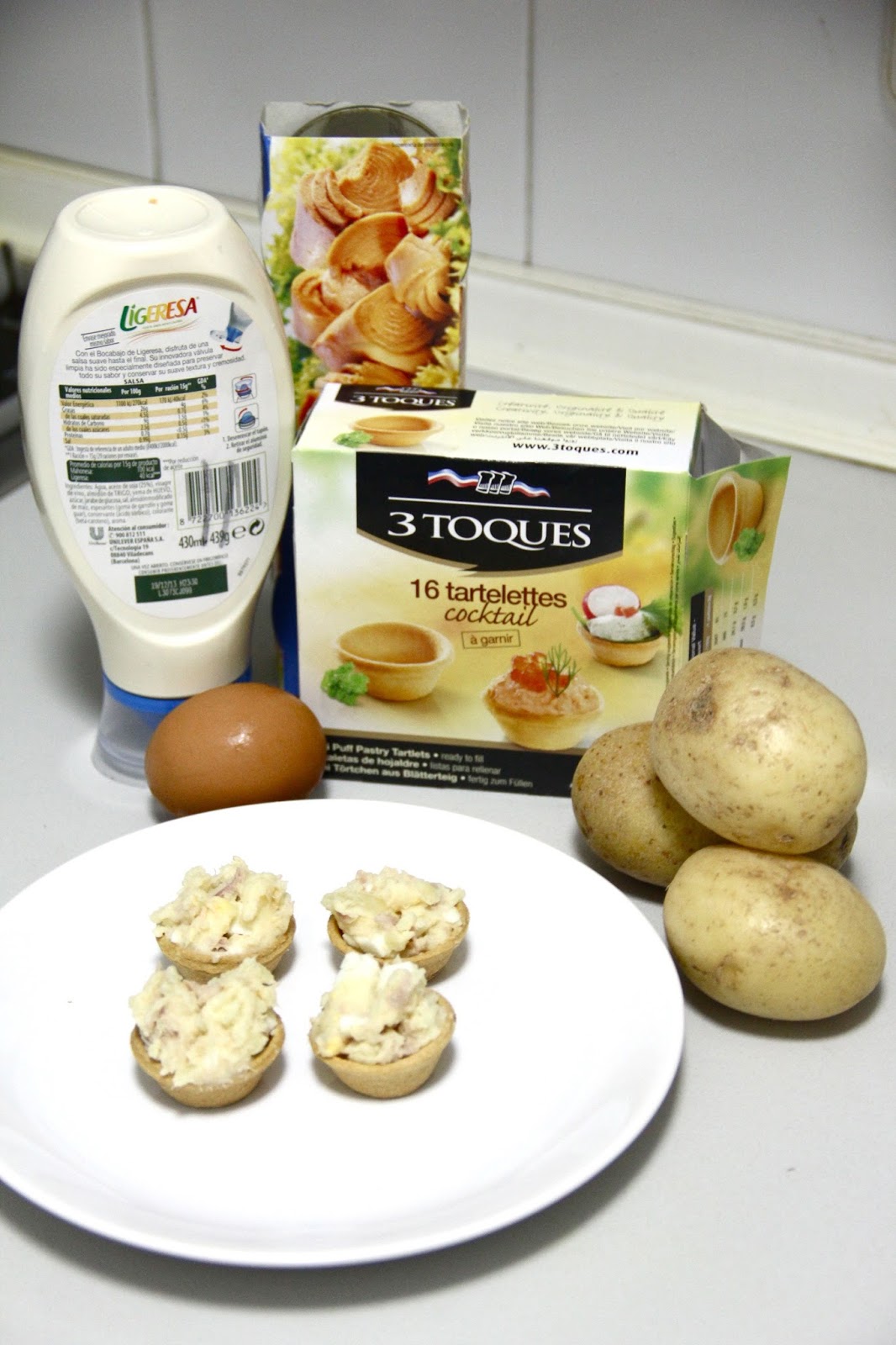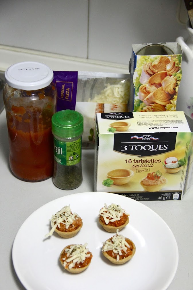 Antes de la previa de uno de los partidos de fútbol decidimos poner un aperitivo y preparamos estas pequeñas tartaletas se pueden rellenar con cualquier cosa nosotros nos decantamos por algo rápido y sencillo una con una mezcla de ensaladilla y la otra con atún, tomate, orégano y queso simulando una pizza.