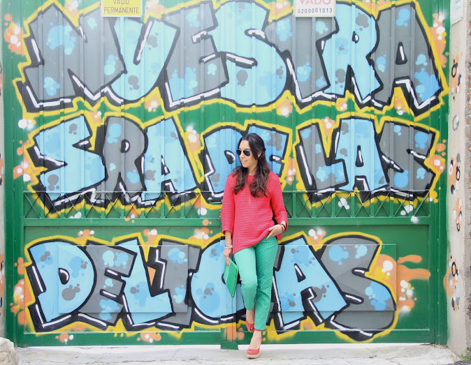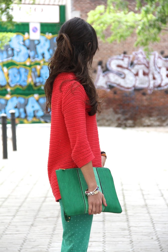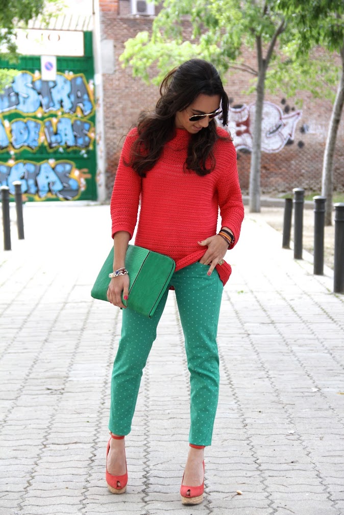 On Friday we went for a walk and enjoy some free time and I decided to premiere my new dots pants, I bought it on Easter. As you see I incorpore some flowers to my manicure, I am preparing another DIY post. Today is a colorful look suitable for the most daring. The wedges “special price” zara are comfortable and their color promises to be a good candidate to get much here in the near future.