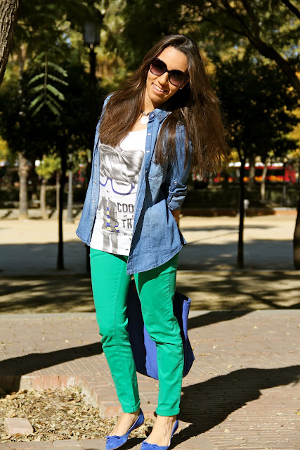 octubre 14, 2012 at 20:25Me encanta la combinación de azul klein y verde! y la camiseta es muy mona 🙂 ! Me quedo por aquí, soy tu seguidora número 400, qué ilu :)!!