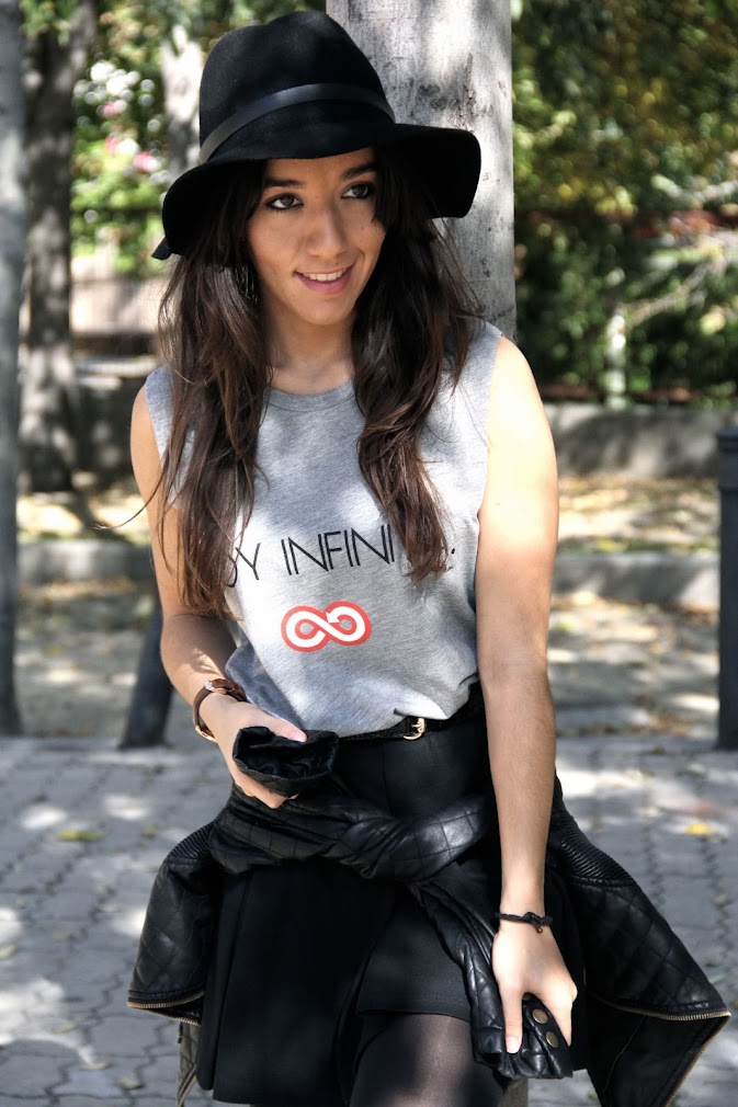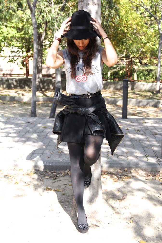 Good morning, today I show you one of the look that I chose to recording the promotional video for the new collection of Ferrutxitas (you can see it again here). But with special touches basic apparel , message t-shirt, hat , leather jacket for a more rocker and manoletinas to endure the day without sore feet air. What do you think about that kind of look?