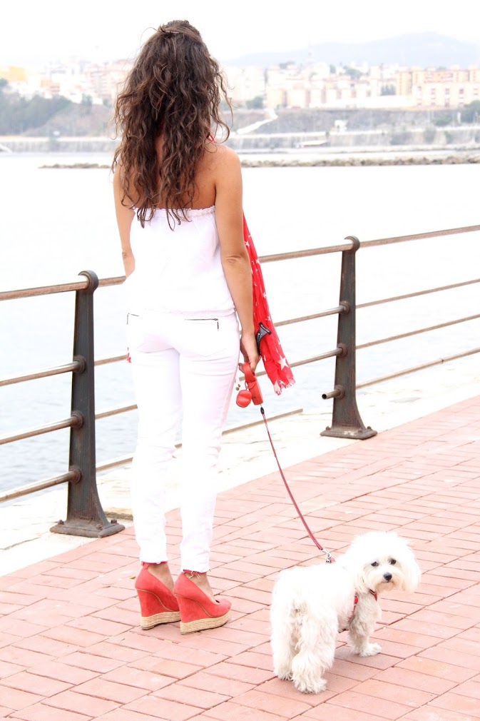 En éste primero os muestro un básico de estas fechas, recurrir al look total blanco te permite innovar en colorido y complementos, yo aposté por el rojo un color que aporta fuerza y energía al look. Y de nuevo tenéis a Bimba por aquí, ya hacia tiempo que no compartía protagonismo con ella, y os aseguro que os gustarán mucho alguna de las fotos que hemos hecho con ella, parecía que sabía posar y todo.