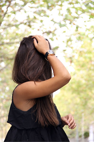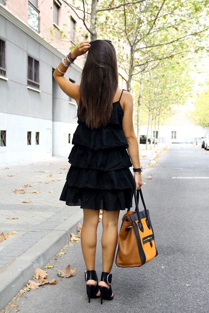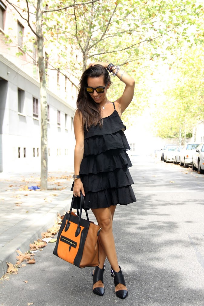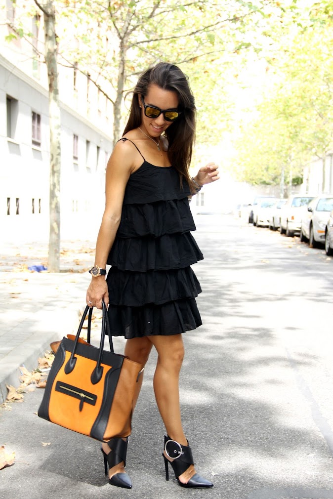 Nunca fui de colores oscuros y el negro no es mi básico, pero reconozco que tiene un punto de elegancia que atrae. Tengo este vestido desde hace ni me acuerdo de años, me encanta su corte, el largo y sobretodo lo cómodo que es. Lo he combinado de mil formas, con sandalia plana, alta, cerrado espartos las acepta todas. Se me ocurrió que era el look perfecto para destacar el complemento estrella del look, el super bolso.