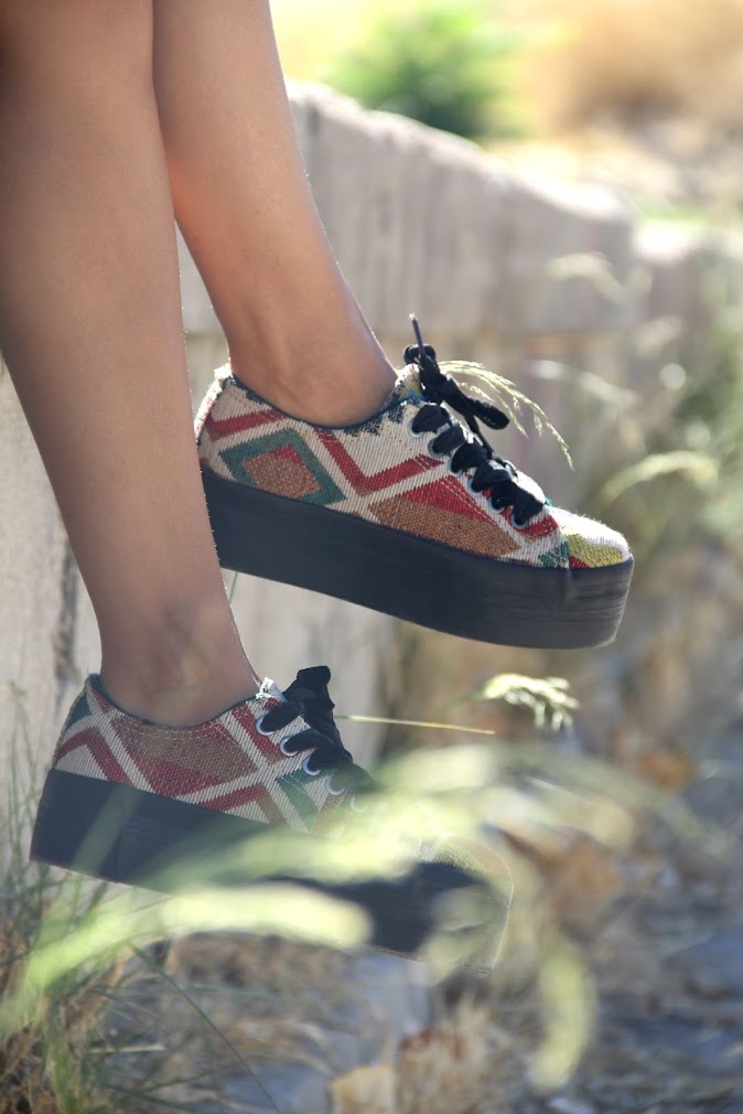 los días siguen siendo largos en cuanto a luz lo que que hace que nos de tiempo a hacerlo todo y volver a casa aún de día, todavía tenemos moreno en la piel por lo que todo luce más bonito y además y es una de las cosas que más me gusta empezamos a ponernos prendas de la nueva temporada mezcladas con la de verano. Hace un par de años cuando mi hermana me enseñó por primera vez unas zapatillas con la suela ancha, lo reconozco me parecieron horrorosas, creía que jamás encajarían en mi armario, pero como siempre os digo la moda hace que cambies de opinión y si el año pasado caí en las negras éste no me he resistido a éstas de Sixtyseven con toque étnico. Lo que más me gustan de ellas son su comodidad, te permite llevar un poco de tacón sin que tus pies se resientan por lo que para los días de no parar son perfectas. Mirando la última semana de vacaciones en casa por internet di con Escapeshoes, una tienda online de zapatos, lo que más me llamó la atención es lo rápido que entregan las compras, algo que valoro especialmente porque no me gusta tener que esperar 10 días para recibir algo, cuando compro estoy deseando estrenarlo y que llegue al día siguiente me encanta y que el envío es gratuito desde una compra con un precio bajo, a partir de 50 euros. Llegó a casa en perfecto estado y con una bolsa de flores secas que tengo guardadas en el armario perfumando uno de los cajones. Queda apuntada en mi lista de webs de compras favoritas, muy recomendable.