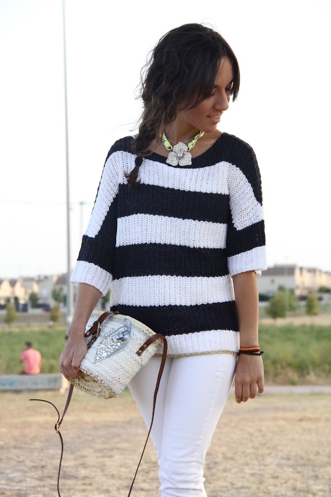 El estilo navy es un clásico y para mi uno de los más elegantes y atemporales. En esta ocasión aposté por combinar zapatos y jersey con rayas con un pantalón liso para cederle todo el protagonismo al estampado.Capazo y un toque de color con el precioso collar flúor que os adelanté por las redes sociales. Tengo collares de muchos tipos pero este tiene algo especial, no se si es el color, la forma o el brillo pero desde que llegó a casa he creado muchos looks neutros para poder ponérmelo una y otra vez, ¡me encanta! Es de la misma firma que las pulseras que tantas me preguntasteis por ellas, Dapa Santander. Su dueña Gema llegó a este mundo de la moda y los complementos totalmente de casualidad. Su marido le había regalado unas entradas para disfrutar de la opera en Viena pero nunca lo disfrutó ya que el espectáculo fue cancelado. Ya que estaban en la ciudad decidió disfrutar de ella y se perdieron entre las calles de la capital austriaca. Allí fue donde descubrió un mercadillo vintage que llamó tanto su atención que decidió comprar muchas piezas y aventurarse en el mundo de los complementos creando cosas que mezclaran lo vintage con las últimas tendencias. Y así fue como gracias a la Opera de Viena hoy podemos disfrutar de creaciones tan bonitas y originales como mi collar.