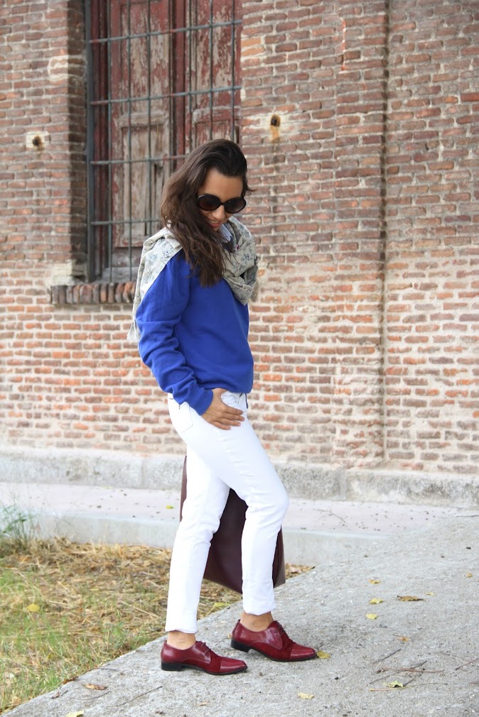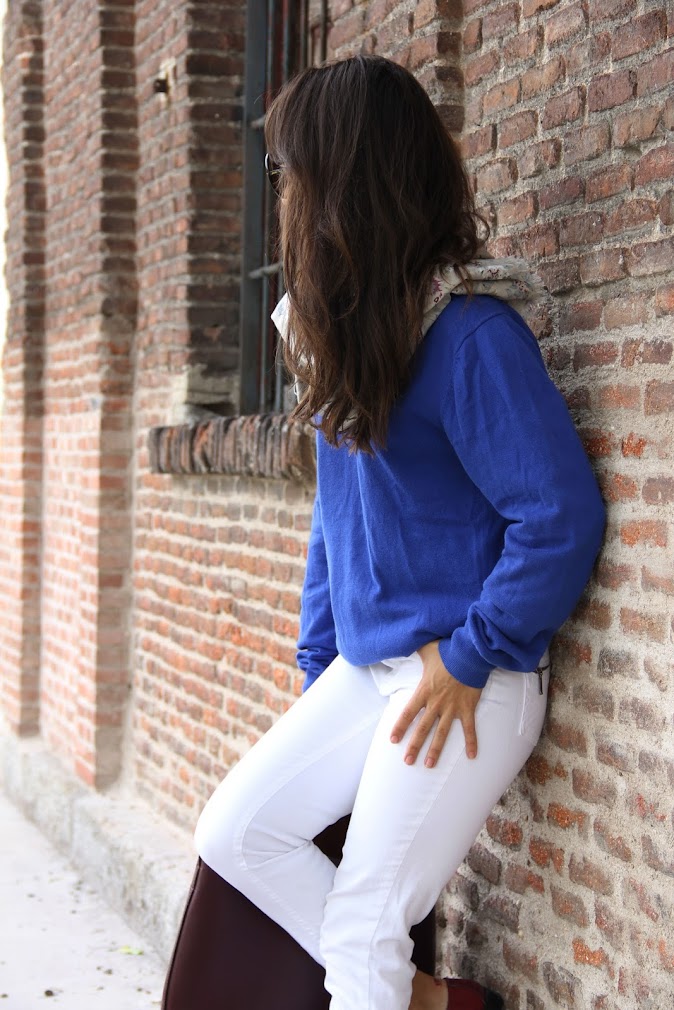 muchas de las cosas importantes en mi vida han pasado en este maravilloso mes que dicho sea de paso es el mes que nací, empecé la universidad en octubre, conocí a mi novio en octubre… espero que este también sea un gran mes lleno de proyectos nuevos. El look de hoy sigue en la línea de básicos de ésta semana, las que me pedisteis ideas sencillas y para todos los días no os podréis quejar ¿eh?, esta es una combinación que repetimos temporada tras temporada, lo único que cambia son los colores y estampados de las prendas. En mi caso me decanté por el combo añil + burdeos con un toque floral. Después del resfriado que pillé la semana pasada he pasado algunos días protegiéndome la garganta con fulares y pañuelo para evitar recaer. Y el pantalón blanco porque ¿quien dijo que el blanco era sólo para el verano? Espero que os gusten las fotos, mañana os tenemos preparado un look muy fiestero, así que si tenéis evento próximamente coged lápiz y papel. GRACIAS por estar un día más ahí, mañana más y mejor.