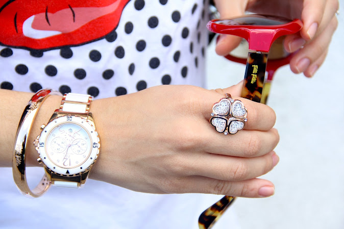 dos bolsos en uno. En vez de hacer el forro de tela como habitualmente se hace, lo han creado en piel y en forma de bolso pequeño que su propia asa larga que puedes ponerte a modo de bandolera. Os lo enseñaré pronto juntos para que los veáis. Repito la camiseta que tanto os gustó. Y las gafas del verano, va a sonar a tontería pero no os pasa que cuando os ponéis algún complemento os sentís vosotras 100% y os gustáis?, pues eso me pasa a mi con las maxi gafas rojas. Mañana habrá nuevo sorteo, no os lo perdáis, ya sabéis como siempre, más y mejor.