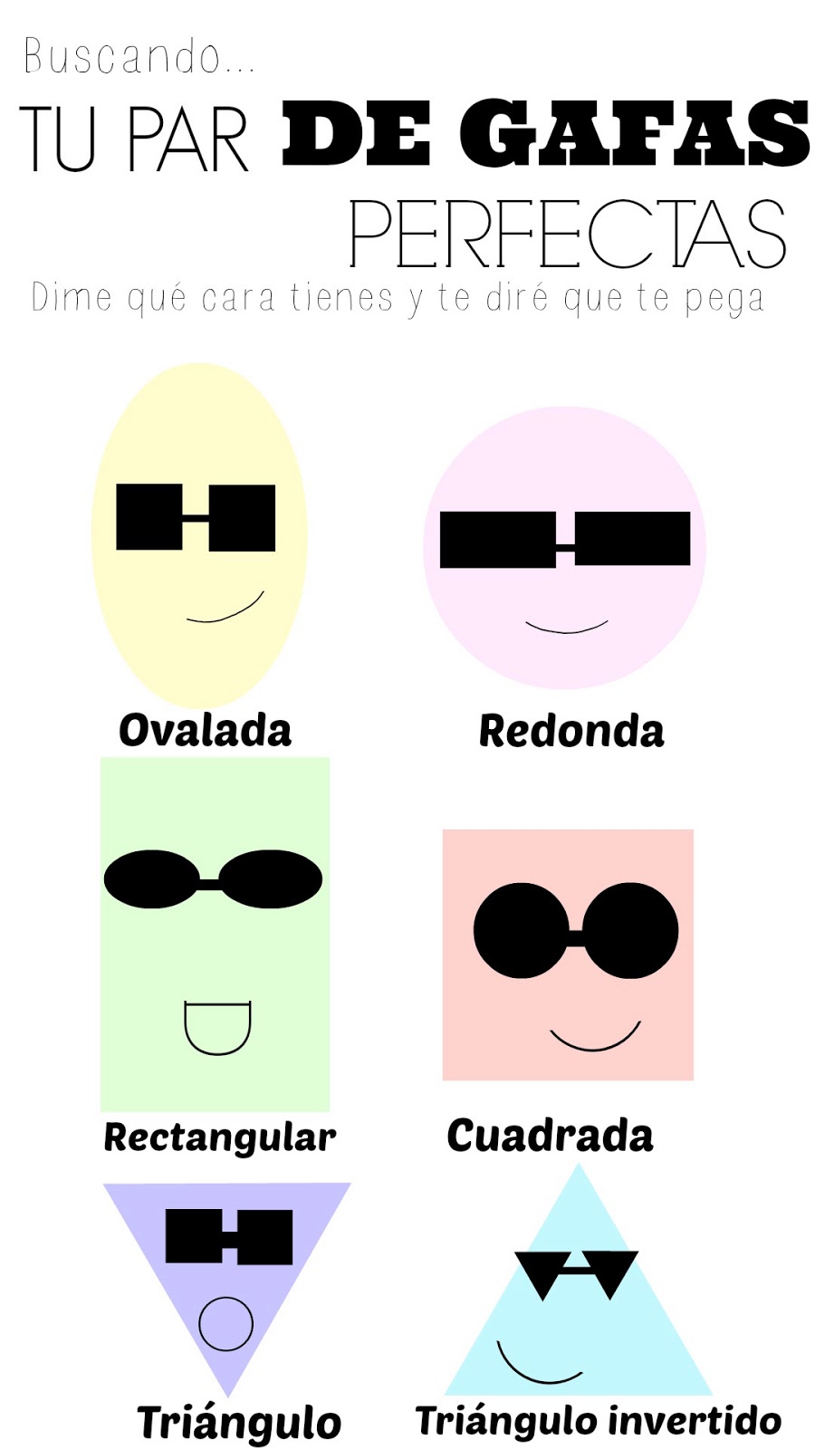 Llegan los primeros rayos de sol el buen tiempo y todos salimos a pasear deseosos de disfrutar del sol que tanto ha escaseado últimamente. Cambiamos los armarios de temporadas e incluimos algún que otro capricho para estar a la última, entre los imprescindibles de ésta época se encuentran las gafas. Vemos que año a año las tendencias se renuevan y cambian radicalmente de color, de forma e incluso de materiales, pero seguro que os ha pasado eso de ver algún modelo en alguna revista, reportaje o anuncio que os ha encantado, habéis acudido corriendo dispuestos a convertirlas en vuestro complemento estrella y ¡sorpresa! Definitivamente esas gafas no estaban hechas para nosotros. Para evitar llevarnos ese fiasco os traigo los tipos de gafas que debéis usar según sea vuestro rostro, porque no hay que olvidar que la moda no es sólo llevar las últimas tendencias, sino por encima de todo, llevar aquello que nos favorezca y con lo que nos sintamos a gusto porque sólo así luciremos con estilo.