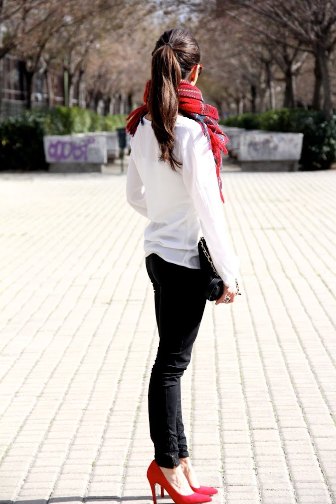 Una vez más recurrí a prendas básicas aportandole el toque diferente con los complementos, en esta ocasión gafas, bufanda y zapatos.