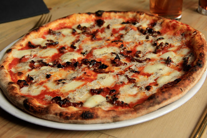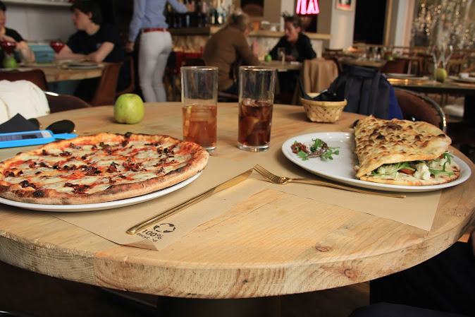 Nos tomaron nota y en poco tiempo teníamos el primer plato que pedimos para compartir, Huevos 65º,con parmetier de tomate seco y jamón ibérico. Toda una explosión de sabores en la boca, suave y muy rico. Y de segundo el plato fuerte, pedimos dos pizzas que también compartimos para poder probar ambas. Son su especialidad, las pizzas hechas en horno de leña. Yo me decanté por la Tartufina, tomates semi-secos, crema de trufa negra y próvola ahumada. Muy sabrosa y tiene es empunto que te hace no querer parar de comer. Mi chico se decantó por una tipo calzone, la piadina, mozzarella de búfala, tomate fresco, anchoa, rúcula, y aceite de oliva. Debo reconocer que la mía nos gusto más, no porque la suya no estuviera rica, que lo estaba, sino porque en la Piadina los ingredientes son fríos, como una ensalada dentro de la masa de una calzone y me gusta más el sabor de las pizzas con “salsas”. De postre no podía irme sin probar la famosa tarta de la tía Leo, de zanahorias, bañado en chocolate blanco con toques de chocolate y almendra y acompañado de helado de canela (perdón a la que lo esté leyendo a la hora de comer, por hacheros la boca agua :P). La combinación de bizcocho con helado y chocolate me encantó, el bizcocho en su punto, sacia pero sin la pesadez que dejan otros, te sientes bien al acabar, algo que se agradece para poder seguir la jornada con ligereza. El ambiente en todo momento invitaba a la relajación, sientes que estas apartado del ajetreo de Madrid, un lugar perfecto para desconectar de verdad. El servicio siempre atento controlando al máximo los tiempos para que no tengas que esperar, y disfrutes de una comida tranquila pero fluida. Y los platos muy ricos, es la mejor pizza que hemos comido desde que volvimos de Italia, así que sí queréis disfrutar como lo hicimos nosotros apuntar su dirección, Calle Orellana 1.