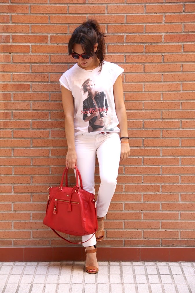 No hay nada más sencillo que una camiseta y unos pantalones, una combinación rápida pero que en función de cómo la combinemos nos puede sacar de muchos apuros. En esta ocasión quise darle un toque de color con los complementos en rojo, ya os avisé que no dejaba de ponerme el bolso. Éste fue el look que elegí ayer para salir a comer, hoy cuando estéis leyendo esto estaré camino de la presentación en primicia de la colección de algunas marcas y esta noche desfile, por lo que me espera un día movidito. Si queréis seguir todos mis movimientos os espero en las redes sociales, soy @lessismoreblog. Ayer fue un día de muchas alegrías que pronto podré compartir con vosotr@s por aquí. El viernes tendréis un gran sorteo, ¡estad atentos!