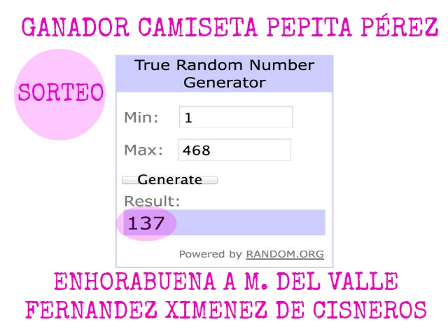 IMPORTANTE: la ganadora tiene que ponerse en contacto con nosotros vía Facebook o email para que nos de todos sus datos, si a las 12:00 horas de la mañana del lunes día 24 no recibimos respuesta se volverá a realizar el sorteo entre los 468 participantes.